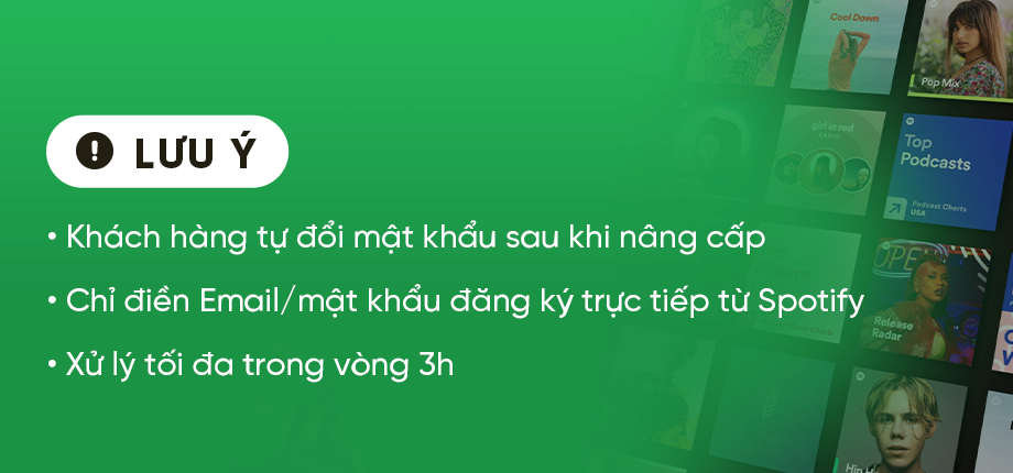 - Bạn cần cung cấp Email và Mật khẩu tài khoản Spotify khi thanh toán đơn hàng. (Không nhận nâng cấp với các tài khoản đăng nhập qua Google, Facebook và Số điện thoại)